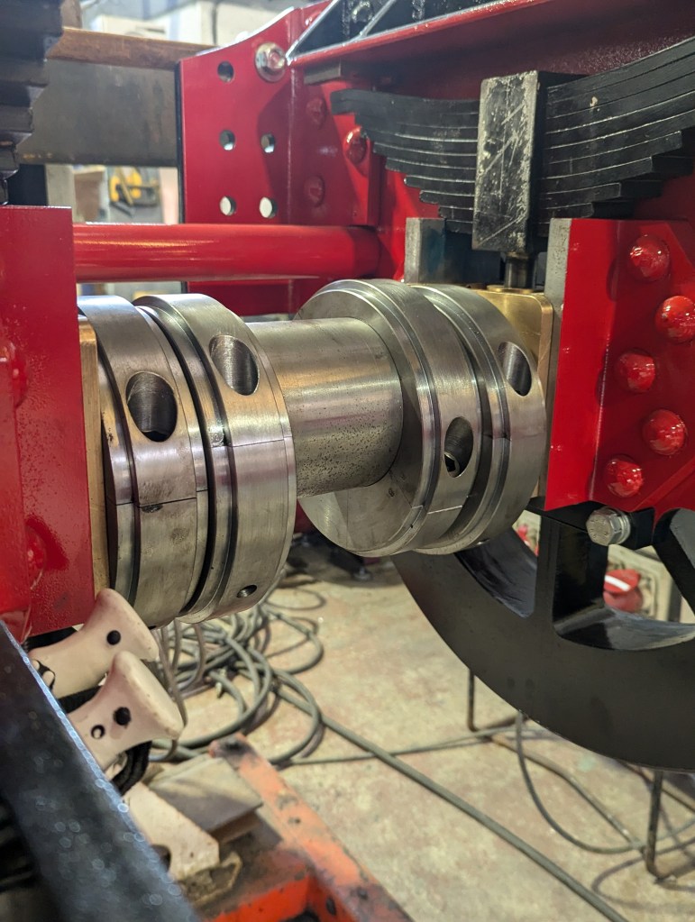 Now we start to assemble said components. This is the first time the complete ensemble has met its final home. Oil holes can now be drilled in the most ergonomic position possible. The weighshaft supports are bolted to the frames, eccentrics clamped to the rear axle , radius rods, lifting links and exclusive to George England, Allen expansion links. Will they all fit together? Find out in next month’s newsletter!